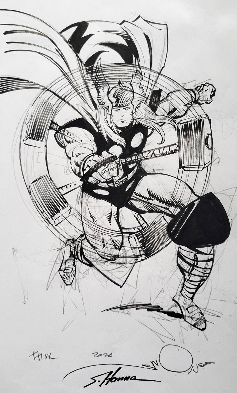 Price: $600.00 Thor twirling his mighty hammer Mjolnir - pencils and india ink on bond 8x14 inked by frequent collaborator Scott Hanna Category: SketchesArtist: Walt Simonson